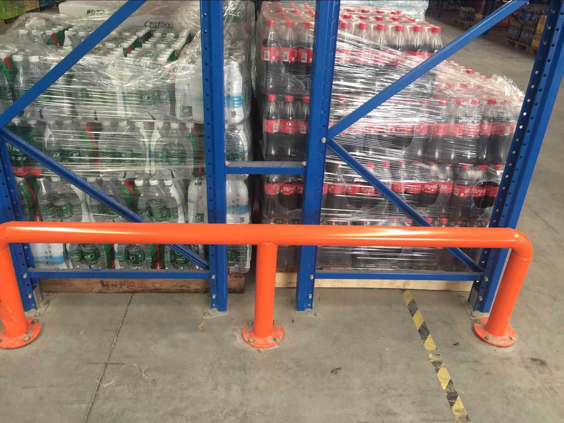 Working principle: It creates a physical standoff barrier between moving equipment and the rack structure. It is designed to withstand and stop a direct, higher-energy impact from a forklift truck, preventing it from reaching the uprights, diagonal braces, or stored goods on the lower levels. It protects a larger vertical and horizontal area than a foot protector alone.